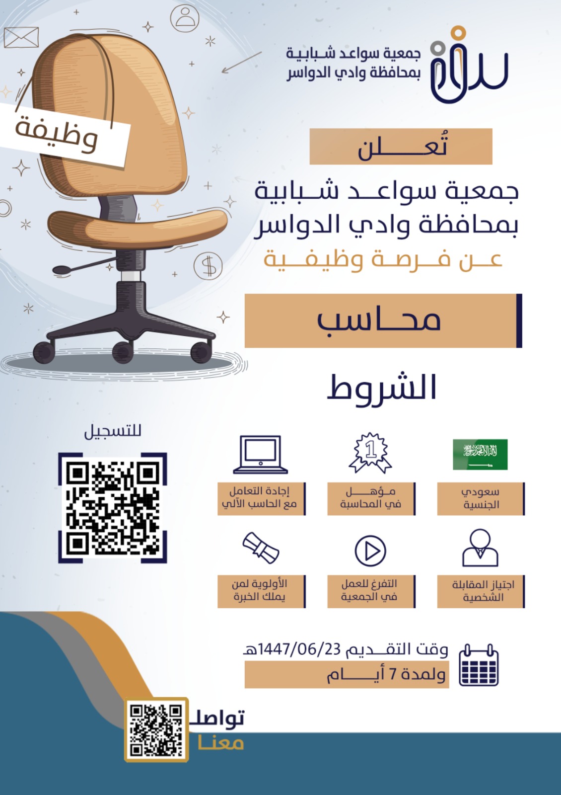 تعلن جمعية سواعد شبابية عن حاجتها لشغل وظيفة (محاسب)